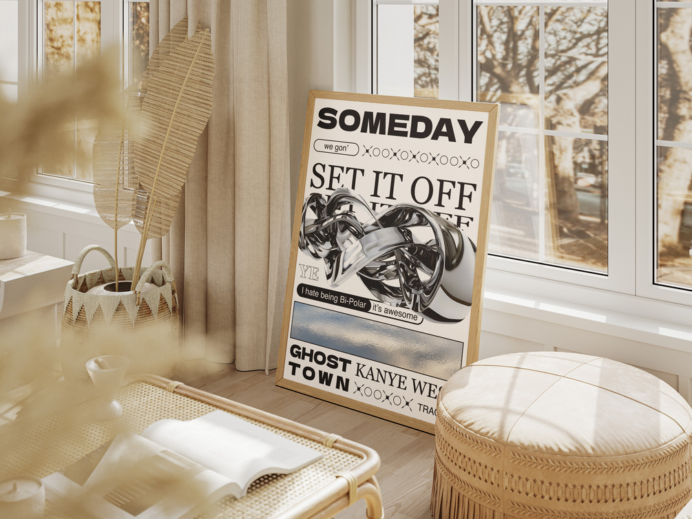 This high-contrast typographic collage fuses distorted chrome forms with bold lettering, echoing Kanye’s raw, off-kilter production. Perfect for bedrooms, studios, or playlists on repeat.