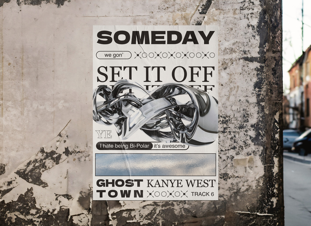 This high-contrast typographic collage fuses distorted chrome forms with bold lettering, echoing Kanye’s raw, off-kilter production. Perfect for bedrooms, studios, or playlists on repeat.